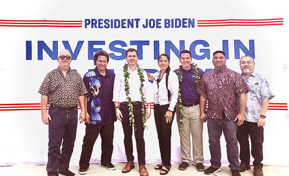 From left to right: HI PMC President Randy Swindell (MM&P), HI PMC VP Luke Kaili (MEBA), U.S. Transportation Secretary Pete Buttigieg, HI PMC Sec-Treas. Hazel Galbiso (SIU), Hawaii Transportation Secretary Ed Sniffen, HI PMC Member Leyton Torda (IBEW Local 1186), HI PMC Member Marc Yamane (IUEC Local 126)