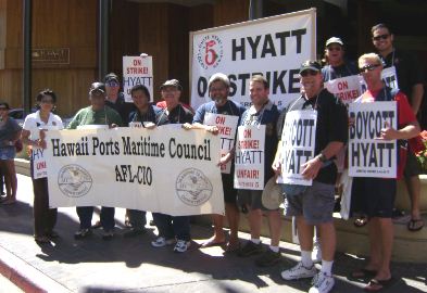 Representatives from several locals affiliated with the Hawaii Ports Maritime Council showed their solidarity by marching with UNITE HERE! members outside the Hyatt in Honolulu during that union’s one-week protest against the chain in early September.