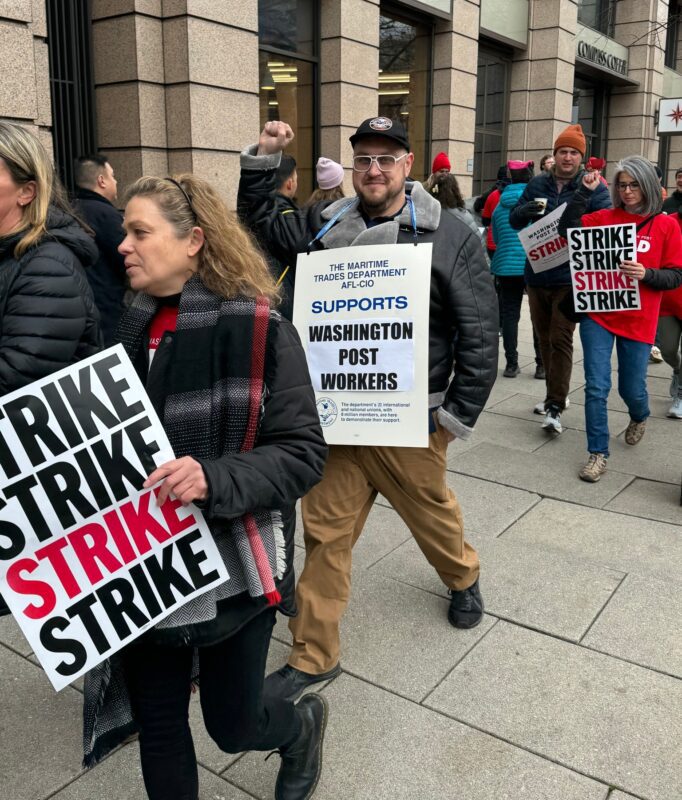Picketers first took their places in front of the Post’s headquarters in downtown D.C. right before sunrise, and continued to hold the line until late in the night. Officials and leaders from across the Labor movement marched with rank and file Post workers, including MTD Executive Secretary-Treasurer Mark Clements.